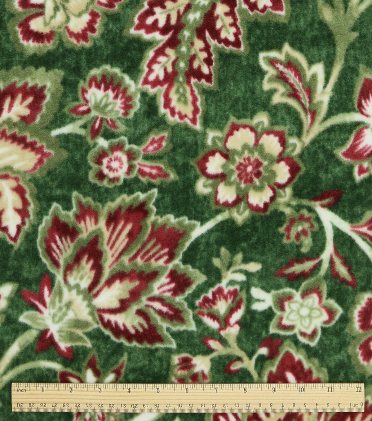 Red Floral Print on Green Luxe Fleece Fabric