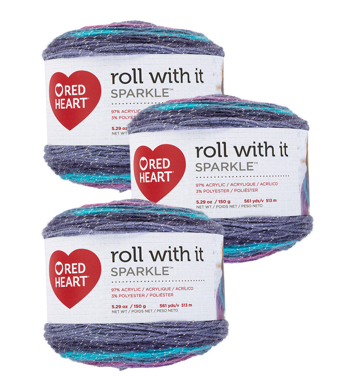 Red Heart Roll With It Sparkle 561yds Worsted Acrylic Yarn 3 Bundle