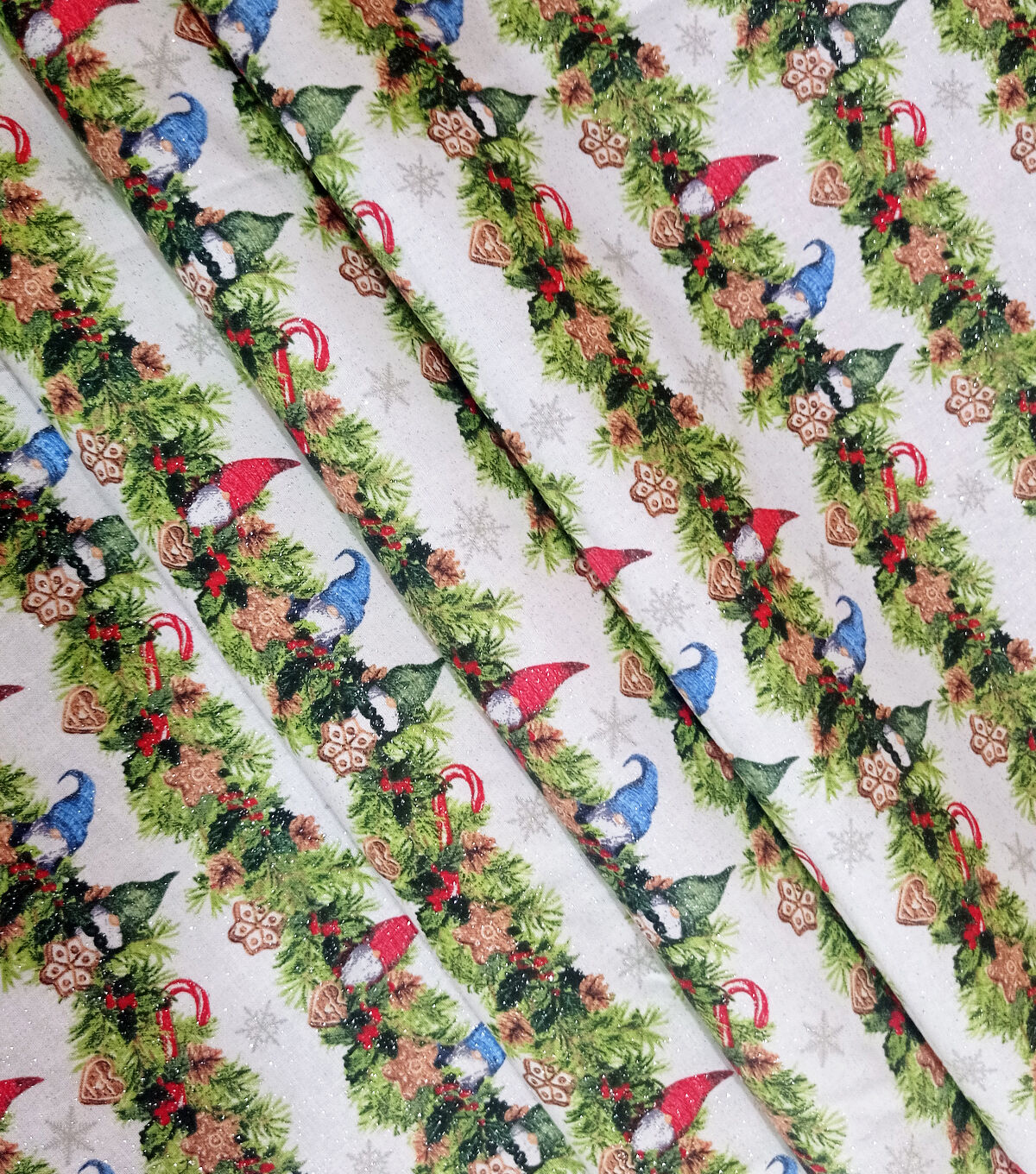 Green Gnome Garland Stripes Christmas Glitter Cotton Fabric