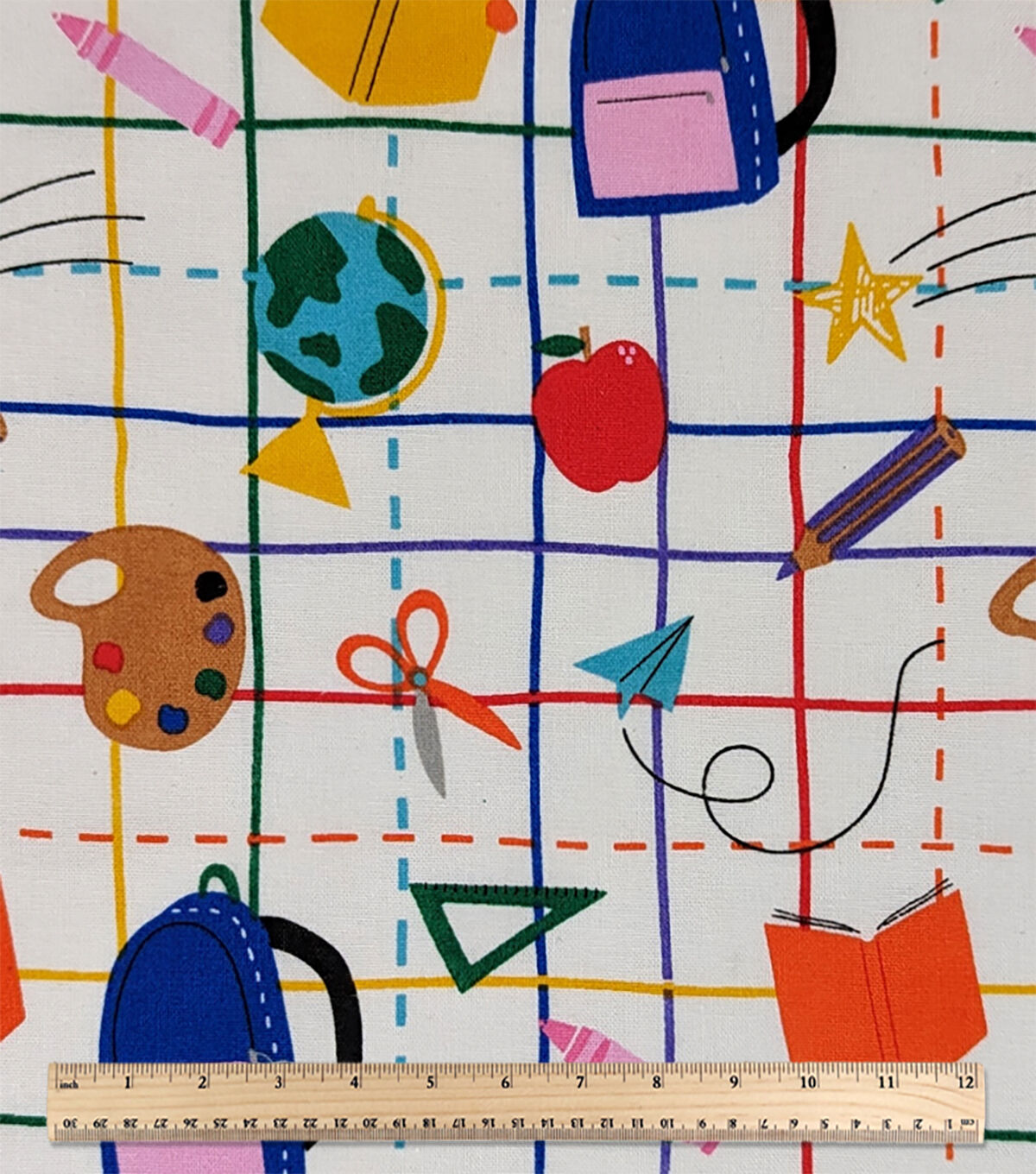 Multicolor School Supplies On Plaid Novelty Cotton Fabric by POP!