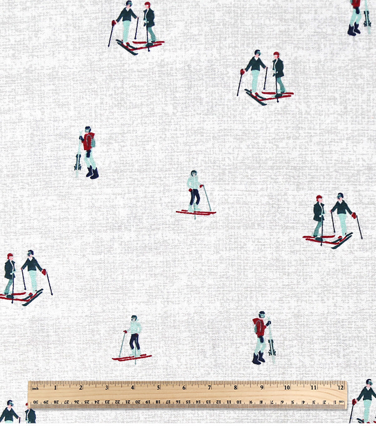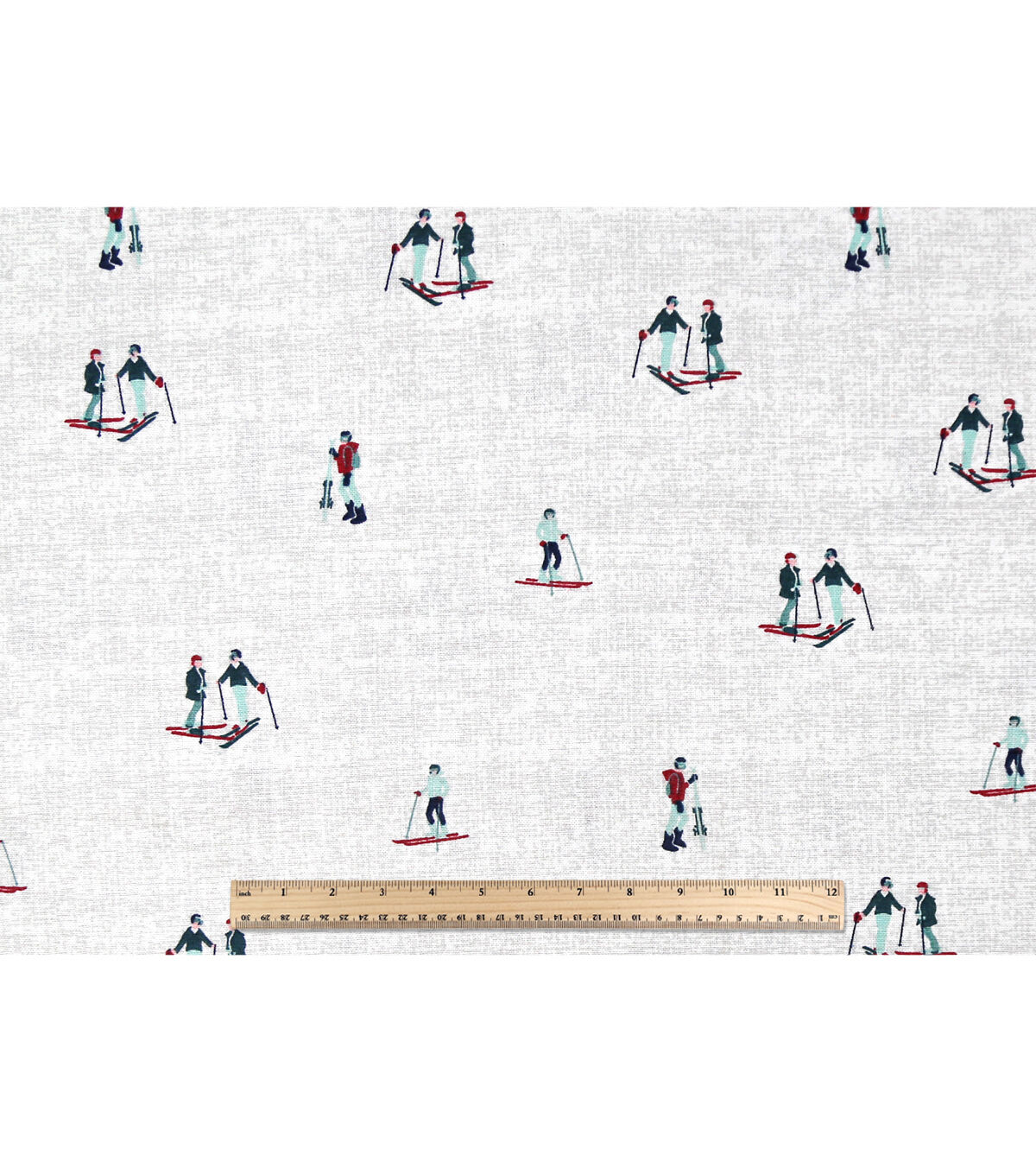 Skiers on White Novelty Cotton Fabric