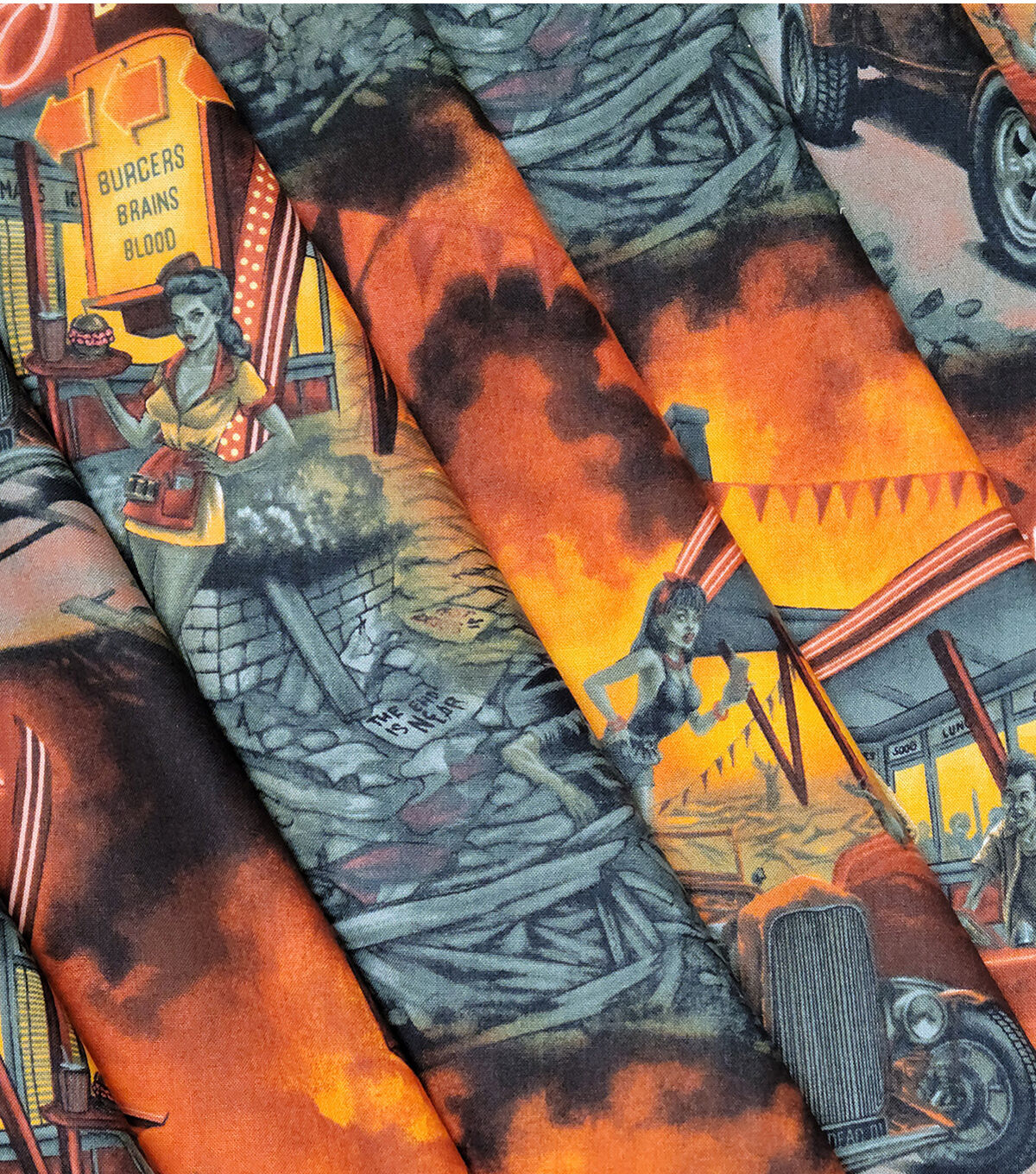 Alexander Henry Orange Zombie Drive In Novelty Cotton Fabric