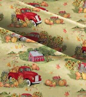 Red Truck On The Farm Harvest Cotton Fabric