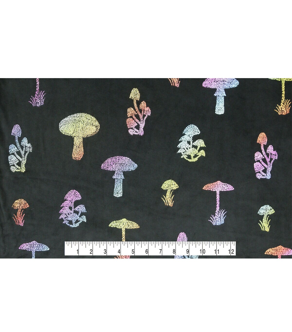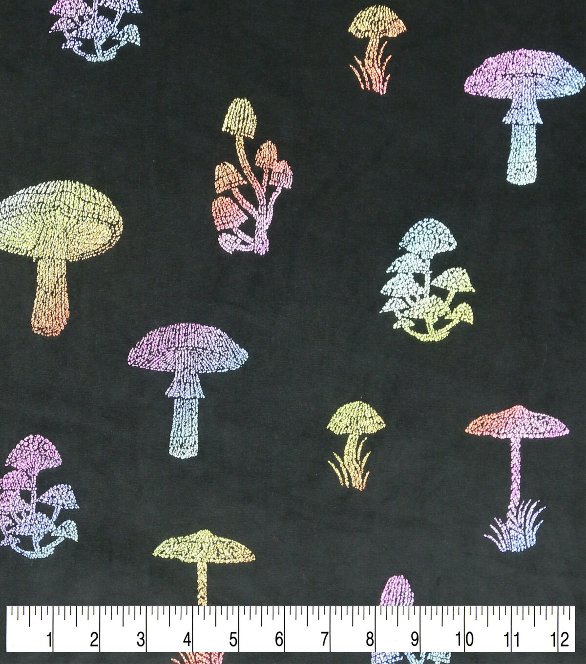 Mutlicolor Metallic Mushrooms on Black Pure Plush Fleece Fabric