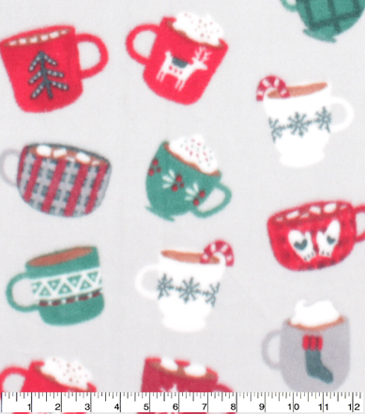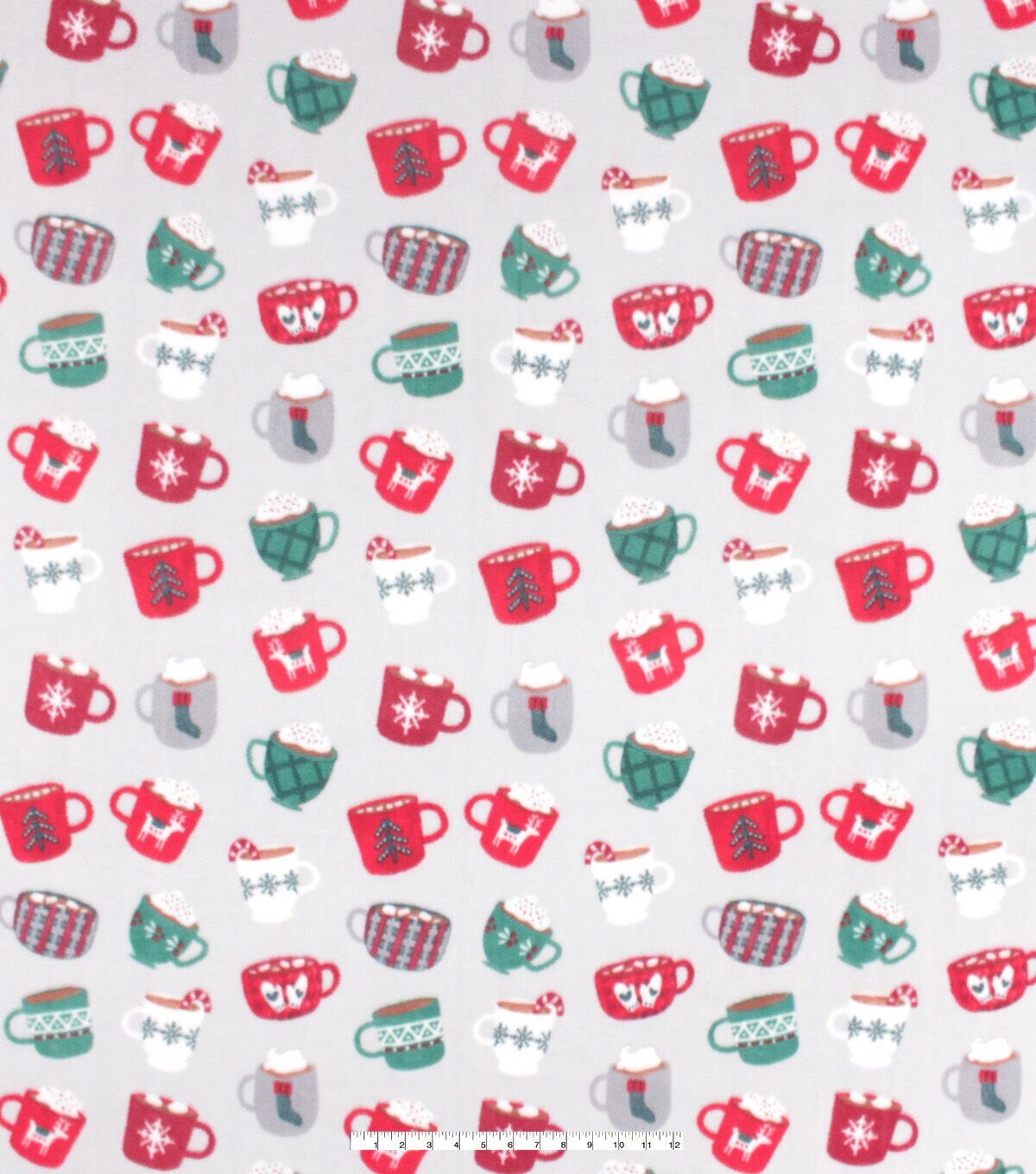 Red & Green Christmas Mugs on Gray Anti Pill Fleece Fabric